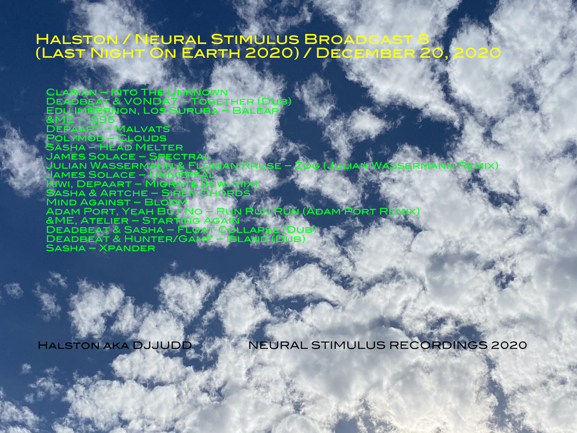 Join me on the 20th of December 2020, at 4pm, for a mix-set of cosmic progressive house / techno of various artists from Last Night On Earth, Sasha’s label. Live on Mixlr.com https://mixlr.com/judd-rubinstein/events/halston-neural-stimulus-broadcast-8 -Halston